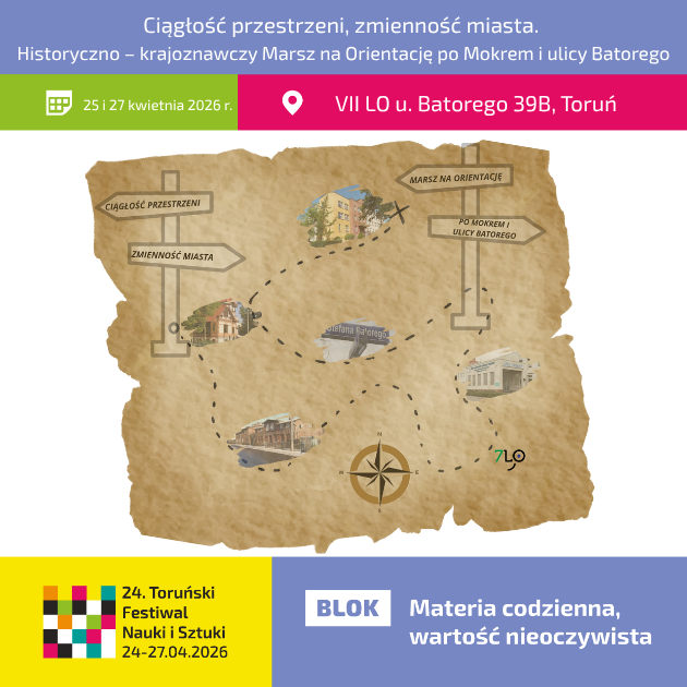 Ponadto nasz projekt „Ciągłość przestrzeni, zmienność miasta. Historyczno–krajoznawczy Marsz na Orientację po Mokrem i ulicy Batorego” został zaakceptowany przez Radę Programową i będzie realizowany w ramach 24. Toruńskiego Festiwalu Nauki i Sztuki.