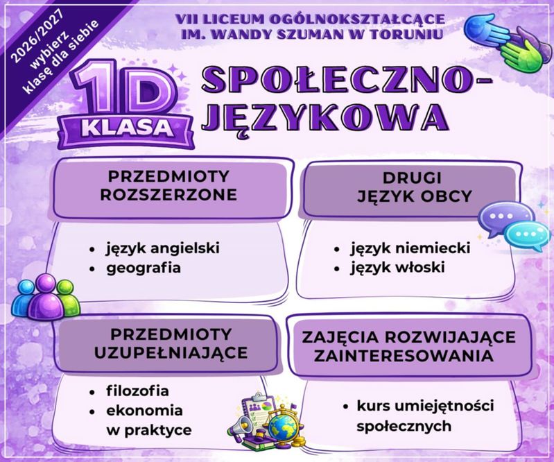 Interesujesz się nauką języków obcych, podróżami i chcesz lepiej zrozumieć mechanizmy rządzące społeczeństwem? Klasa 1D to świetny wybór dla przyszłych dyplomatów/ek, przedsiębiorców/czyń, dziennikarzy/ek i specjalistów/ek ds. komunikacji!